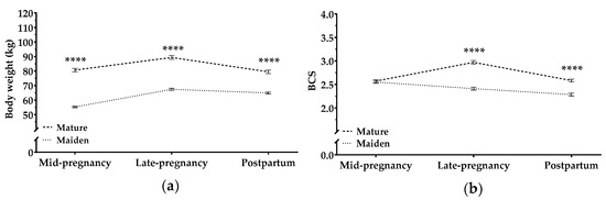 BW and BCS were higher in mature ewes than in maiden ewes at all time points (p < 0.0001; Figure 3). Both groups increased significantly in BW during pregnancy (both p < 0.0001), but only mature sheep increased significantly in BCS (p < 0.0001).