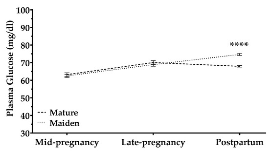 Plasma glucose concentrations (mg/dL) in mature ewes (dashed line) and maiden ewes (dotted lines) throughout the study period. Data are mean ± S.E.M. The time × age-group interaction was significant (p < 0.0001). Asterisks indicate significant differences between age groups (**** p < 0.0001).