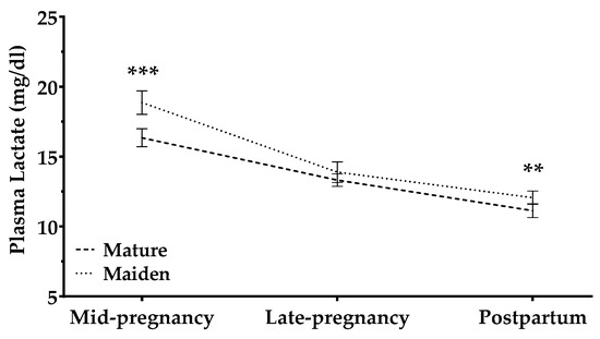 Plasma lactate concentrations (mg/dL) in mature sheep (dashed line) and maiden sheep (dotted lines) throughout the study period. Data are mean ± S.E.M. Asterisks indicate significant differences between age groups (*** p < 0.001; ** p < 0.01).