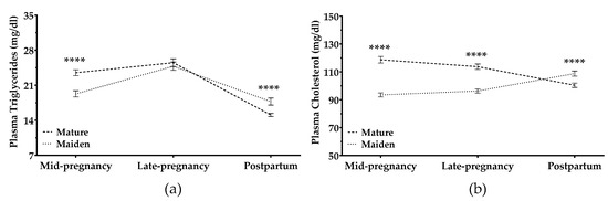 Maternal plasma concentrations of triglycerides and cholesterol increased during pregnancy (p < 0.0001; Figure 6a,b). Both parameters were higher in maiden than mature ewes during the entire pregnancy. Triglycerides decreased in all sheep after lambing, and this decrease was greater in mature ewes (Figure 6a). In contrast, cholesterol decreased in mature but not maiden ewes (Figure 6b).