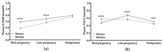 Concentrations of β-hydroxybutyrate (β-OHB) and non-esterified fatty acids (NEFA) in plasma changed in different ways during pregnancy. Plasma β-OHB levels increased during and after pregnancy in mature and maiden sheep; the increase was significantly steeper in maiden sheep (p < 0.0001; Figure 7a). In mature ewes, NEFA levels increased during pregnancy and decreased postpartum; in maiden sheep, NEFA levels decreased steadily with pregnancy time and decreased further after pregnancy (p < 0.001; Figure 7b).
