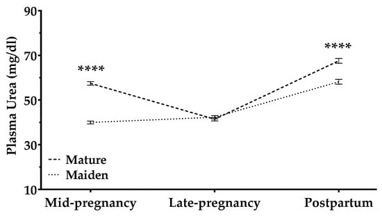 Plasma urea levels were affected by a significant interaction between sheep age and pregnancy stage (p < 0.0001). In mature ewes, urea levels decreased throughout pregnancy and increased after pregnancy; maiden sheep showed a slight, constant increase during pregnancy and postpartum (Figure 8). This increase was steeper after lambing than between mid and late pregnancy.
