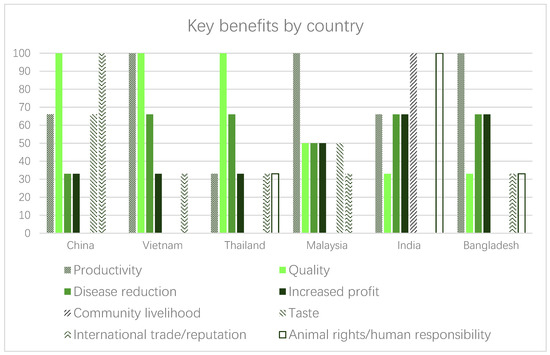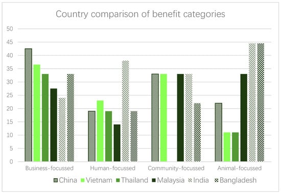 Comparison within countries regarding the appearance of certain perceived benefits for addressing animal welfare. Note: the values represent the % of focus groups that indicated the selected benefit within that country.