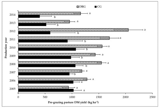 Pre-grazing pasture biomass yield (kg ha−1) harvested at the end of June for the grazing system (CG = continuous grazing, DRG = deferred rotational) × year interaction (p ≤ 0.05) over the experimental period. Significance difference among treatment within a year was indicated by lower case letters (a, b) and standard error of means was indicated by error bars.