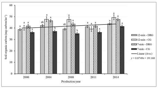Soil organic carbon stock adjusted for equivalent soil mass of 4000 Mg ha−1 within a 30 cm depth for the seed mixture (7-mix, 12-mix) × grazing system (CG = continuous grazing, DRG = deferred rotational grazing) interaction within the production year of 2000 to 2014. Significance difference among treatment within a year was indicated by lower case letters (a, b) and standard error of the means was represented by error bars.