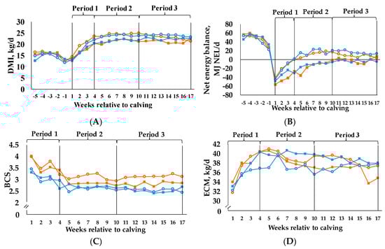 Weekly means of DMI, net energy intake (NEI), net energy balance (NEB), milk yield, and milk components were used for further calculations. Computations of net energy requirements for maintenance (NEM) and lactation (NEL) as well as for milk energy concentration were based on equations published by the Society of Nutrition Physiology [16]: