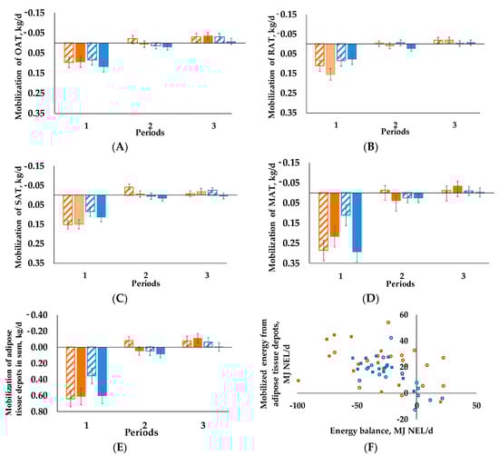 Mobilization of the single adipose tissues and the sum of the (A) omental (OAT), (B) retroperitoneal (RAT), (C) subcutaneous (SAT), (D) mesenteric (MAT), (E) adipose tissues, negative values represent accretion of adipose tissue, positive values describe mobilization, LSMeans) of the experimental groups during the three periods, period 1: weeks 1–4 postpartum, period 2: weeks 5–10 postpartum, period 3: weeks 11–17 postpartum); as well as the (F) correlation of mobilized energy from adipose tissues and energy balance for each individual cow in period 1 (correlation coefficient = −0.4634, p < 0.05). Cows were categorized in high BCS (BCSH) and low BCS (BCSL). After parturition, these two groups were divided again, each into a group with a concentrate proportion of 60% (C60) in the ration (increasing from 35–60% during the first three weeks after calving) and a group with a concentrate proportion of 35% (C35) in the ration. Thus, four groups emerged: BCSH/C60 (n = 15; A–E orange striped bars, F ○) BCSH/C35 (n = 14; A–E orange bars, F ■), BCSL/C60 (n = 15; A–E blue striped bars, F ○), BCSL/C35 (n = 15; A–E blue bars, F ■). Error bars indicate SEM. Mixed models are analyzed with first measured value before calving as covariate, (A) p-values: BCS = 0.216, C = 0.213, period < 0.001, BCS × C = 0.536, BCS × period = 0.734, C × period = 0.953, BCS × C × period = 0.382; (B) p-values: BCS = 0.428, C = 0.381, period < 0.001, BCS × C = 0.648, BCS × period = 0.089, C × period = 0.526, BCS × C × period = 0.382; (C) p-values: BCS = 0.740, C = 0.250, period < 0.001, BCS × C = 0.549, BCS × period = 0.002, C × period = 0.788, BCS × C × period = 0.244; (D) p-values: BCS = 0.703, C = 0.163, period < 0.001, BCS × C = 0.034, BCS × period = 0.480, C × period = 0.366, BCS × C × period = 0.065; (E) p-values: BCS = 0.984, C = 0.138, period < 0.001, BCS × C = 0.311, BCS × period = 0.087, C × period = 0.595, BCS × C × period = 0.232.