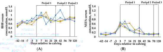 Results for BHB (Figure 3A) and NFEA (Figure 3B) are presented in d, as the measuring points were determined in d relative to calving. Nevertheless, in accordance with the other data, the statistical analyses are calculated in periods and start at calving.