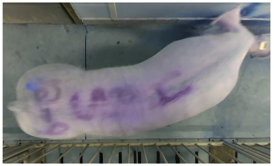 A low-cost identification system, optical character recognition, is the recognition of printed, stamped, or written text characters (e.g., license plates, barcodes, QR codes) by a computer. In pig production, optical recognition includes characters on ear tags or painted symbols and numbers (Figure 2). Optical character recognition is performed with a digital camera and data is developed with machine learning to provide remote identification [36]. Depending on the clarity and color of the markings, there is the capacity to identify large permutations of animals and, with the exception of optical character recognition on tags, the identification may not need to be removed from pigs prior to slaughter [55]. When the characters are painted, visual identification patterns can fade within a day and when pigs lie close to or on one another, pattern recognition is occluded [56].