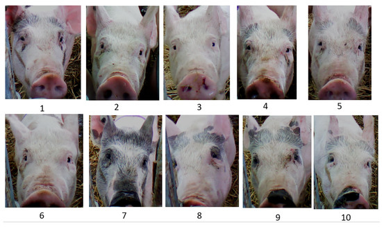 An example of marker-less individual pig identification is facial recognition, initially developed for human identification, monitoring, and surveillance purposes [57]. Using methods known to efficiently recognize human faces, Wada [58] examined frontal photos from 10 pigs and achieved 77.0% recognition from the full face and 97.9% when the reading was focused on the eye region. Hansen [47] used digital photos taken from a camera mounted on a water drinker and developed a program that differentiated 10 pigs (Figure 3) [47], with 96.7% accuracy. Hansen’s algorithm recognized pigs from three regions: the snout and wrinkles above the snout, prevalent marking at the top of the head, and the eye regions. This technology is promising due to the speed of recognition (620 images/sec) and the application of human recognition algorithms for pig faces.