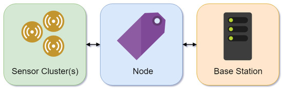 Wireless sensor networks (WSNs) often consist of a sensor(s), node and base station (Figure 4). Generally, low-cost and low-power, multifunctional sensors such as a thermistor, accelerometer and battery are clustered in one node. For pig production, the sensors, such as accelerometers, are encapsulated within an ear tag (node) which holds the sensor package for communication. The node sends information to the base station which provides connectivity to the server or might perform computational tasks [117].