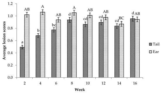 Nevertheless, tail lesion scores of finishers were marginally higher than those of weaners, which again agrees with previous studies []. This could be due to the accumulation of tail biting damage over time.