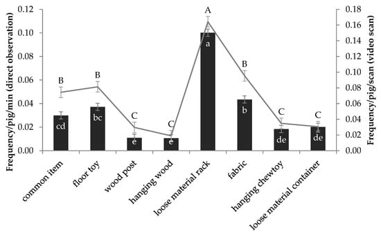 The overall pig interaction frequency with each category of enrichment at a pen level (n = 8) via direct observation (bar chart, different small letters denote significant difference) and video scans (line chart, different capital letters denote significant difference). The data are presented as the mean ± S.E.