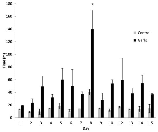 Length of time spent interacting with the control (untreated) rope compared with the garlic treated rope for each day over the study period. There was a significant effect of treatment (p = 0.017), but no effect of time (p = 0.159) or a treatment x time interaction (p = 0.307). The asterisk represents when the treatment rope was re-sprayed with garlic oil (day 8).