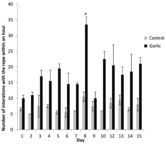 Number of interactions observed within an hour for the control (untreated) rope compared with the garlic treated rope each day over the study period. There was a significant effect of treatment (p = 0.004), but no effect of time (p = 0.143) or a treatment x time interaction (p = 0.242). The asterisk represents when the treatment rope was re-sprayed with garlic oil (day 8).