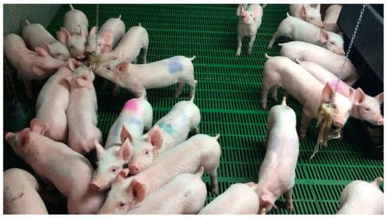 - Blackshaw, J.K.; Thomas, F.J.; Lee, J.-A. The effect of a fixed or free toy on the growth rate and aggressive behaviour of weaned pigs and the influence of hierarchy on initial investigation of the toys. Appl. Anim. Behav. Sci. 1997, 53, 203–212. [Google Scholar] [CrossRef]