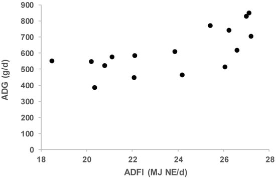The ADFI, NE50, and NE100 values ranged between 18.5 and 27.2 MJ NE/d, 15.7 and 24 MJ NE/d, and 19.3 and 35.2 MJ NE/d, respectively. The breeds with higher ADGs presented generally higher ADFI even if the relationship was not strict (Figure 2). For conventional breeds, Vautier et al. [8] reported NE50 values ranging between 18.6 and 24.0 MJ NE/d and for NE100 ranging between 23.7 and 31.2 MJ NE/d. The difference between conventional and local breeds is not so clear here. In the present study, we collected data in feeding conditions that were supposed to be ad libitum. Assuming a ratio NE/metabolizable energy (ME) of 0.74 and the NRC (National Research Council) value for ME for maintenance (448 kJ ME per kg BW0.75; [4]), and using feed allowance indicated in Table 1, it can be estimated then that feed allowance ranged in our data from 2.23 (Iberian study 1) to 3.32 (Mangalitsa and Moravka) times ME for maintenance. In reference to the assumption that voluntary DFI equals approximately 3 to 4 times the ME requirements for maintenance, some breeds could have been somewhat below ad libitum conditions.