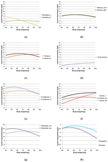 Standardized ileal digestible lysine requirement (g/d) for nine local breeds depending on body weight (kg) during the period 40–100 kg BW: (a) Alentejana; (b) Basque; (c) Bísara; (d) Cinta Senese; (e) Apulo Calabrese; (f) Iberian; (g) Krškopolje; (h) Mangalitsa and Moravka.