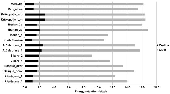 The energy retained in protein and lipid ranged between 0.97 and 2.77 MJ/d and 7.28 and 14.95 MJ/d, respectively (Figure 4). The total energy retention ranged between 9.22 and 16.88 MJ/d. In all breeds and profiles, a low proportion (8% to 21%) of total energy retention was directed towards protein, with the remaining proportion being dedicated to lipid deposition. In InraPorc, ingested energy is modeled as being used first for maintenance functions (including physical activity), with the remaining energy being used for protein deposition and then for lipid deposition. As such, lipid deposition is considered as an energy sink, as often the case for modelling approaches on pig growth [12]. Energy deposition in the studied breeds, presenting low PD, is then oriented mainly to lipid deposition, which is taken into account in the model. This reflects also the observations that pigs from local breeds are considered to be fatty pigs, or at least fatter than conventional breeds [18]. As indicated in the review of Candek-Potokar et al. [18], the average lean meat percentage for the local breeds included in the present study was situated between 32.9% and 48.4%, and the average loin eye area was between 18.1 to 36.3 cm2, which demonstrates low muscular development. With lower PDm than conventional breeds but comparable NE50 and NE100, a larger part of ingested and retained energy is dedicated to lipid deposition, explaining the higher fat composition of the carcasses of these breeds [18].