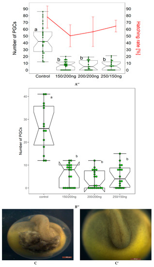 Number of FITC-labeled PGCs reduced from neurula stage to tail bud stage after embryos were injected with RNPs (sgRNAs+Cas9 protein). (A) Control group and RNPs injected group with FITC-dextran to label the PGCs at tail bud stage [40], respectively. Embryos injected with RNPs (A’) are lacking the FITC-labeled PGCs around surround the region where tail develops; however, in control group (A) FITC-labeled PGCs can be easily seen. (A’’): Different concentrations of sgRNAs and Cas9 protein were used to find optimal concentrations; however, no significant difference of sgRNAs/Cas9 concentrations was found on FITC-labeled PGCs (box graphs). Hatching rates were also found to be insignificant (line graph). (B,B’): In fluorescent image, many FITC-labeled PGCs can be seen in gonadal region (under a white broken line) in the control group (B); however on the contrary no FITC-labeled PGCs can be seen at the same region when injected with RNPs complex (B’; under white broken line). Number of FITC-labeled PGCs were observed by opening the body cavity of larvae, FITC-labeled PGCs were found to be in lower number when different concentrations of sgRNAs/Cas9 were used; while in the control group, FITC-labeled PGCs were found in a higher number (B’’). (C) Malformed embryo at 4 dpf after the injection of RNPs (in one batch of eggs from one female) and the non-injected control group (C’). The boxes with different letter show the significant difference (p < 0.05).