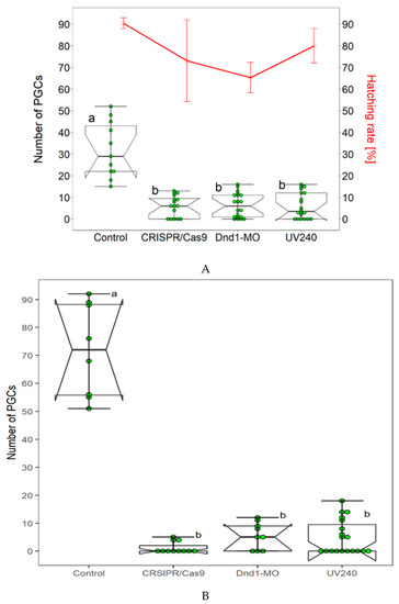 - Saito, T.; Guralp, H.; Iegorova, V.; Rodina, M.; Pšenička, M. Elimination of primordial germ cells in sturgeon embryos by ultraviolet irradiation. Biol. Reprod. 2018, 99, 556–564. [Google Scholar] [CrossRef]