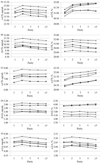 Least squares means of (A) α-casein (α-CN), (B) β-casein (β-CN), (C) κ-casein (κ-CN), (D) β-lactoglobulin (β-LG) and (E) α-lactalbumin (α-LA) across parity for Brown Swiss (-♦-), Holstein-Friesian (-□-), Alpine Grey (-△-), Simmental (-●-) and Pinzgauer (-×-) cows, expressed as mg/mL of milk (on the left side) or percentage of crude protein (on the right side).