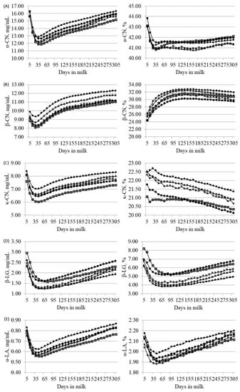 Least squares means of (A) α-casein (α-CN), (B) β-casein (β-CN), (C) κ-casein (κ-CN), (D) β-lactoglobulin (β-LG) and (E) α-lactalbumin (α-LA) across lactation for Brown Swiss (-♦-), Holstein-Friesian (-□-), Alpine Grey (-△-), Simmental (-●-) and Pinzgauer (-×-) cows, expressed as mg/mL of milk (on the left side) or percentage of crude protein (on the right side).