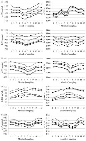 Regarding monthly variation of the amount of protein fractions (mg/mL of milk), caseins and α-LA followed the same trend as CP (Supplementary Figure S3), with a general decrease during the summer period and the minimum in June–July (Figure 3). Such trend was previously reported by Bernabucci et al. (2015) [] and was correlated to heat stress affecting cows during summer. On the contrary, β-LG increased during the summer period, probably due to its immunomodulatory role. Percentage of α-CN showed two major peaks in April and July, whereas κ-CN (%) slightly decreased during summer, with a minimum in July, and β-CN (%) exhibited only small variations across months of sampling. Finally, β-LG (%) slightly increased between May and September, and α-LA (%) had an erratic trend, with the greatest percentage in November. Similar trends for protein fractions were reported by Bernabucci et al. (2015) []. Seasonal impacts on protein fractions could be the result of the pasture system applied in alpine areas during summer [].