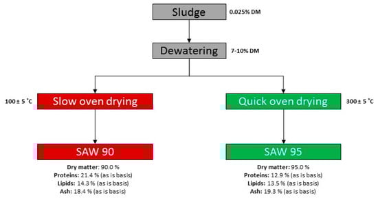 Upon reception of SAW 90 and SAW 95 at Protix (Dongen, NL), they were examined for physical characteristics, such as texture, colour, and smell. Both of the ingredients were then standardized to 30% dry matter by the addition of appropriate amounts of lukewarm tap water (40 ˚C) before feeding.