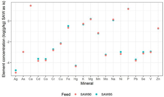 Table 2 shows the dry matter, crude protein, lipid, ash, and carbohydrate contents of the larvae. The statistical difference between the composition of larvae obtained using two feed mixes was analysed using the Wilcoxon rank-sum test, with only the dry matter showing a statistically significant difference (p-value = 0.003). In the current study, the crude protein content of the larvae fed with two SAW mixes (~ 40% of DM) were similar to previously published data of BSFL [], but lipid content was significantly lower (~ 7% of DM) as compared to the commonly reported lipid composition of BSFL (~ 25–30% of DM) []. Lipid accumulation in insects varies with exact life stage, diet, and environment, and these larvae may have lower lipid amounts due to the lack of available lipids and carbohydrates in the diet, which also likely remains a reason for their low growth []. It has been already indicated in Figure 2 that both SAW ingredients have substantial amounts of cadmium, copper, and zinc. Lindqvist et al. (2001) and Ortel et al. (1995) describe how high levels of dietary metals, including cadmium, copper, and zinc are linked to reduced fat accumulation in insects [,]. It could be that the low availability of nutrients, such as lipids and carbohydrates, increases the accumulation of heavy metals and other elements, but additional research is needed to confirm this hypothesis.