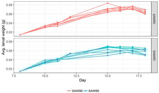 The feeding trials were conducted over a period of ten days. Larvae were sampled and weighed at the start of the test (Day 0) and on Days 2, 3, 4, 5, 6, 7, 8, 9, and 10, respectively. On Day 10, the larval and residue yield were also calculated. Figure 3 shows the growth curves for 16 crates studied in the present work. Growth of larvae fed with two SAW mixes was more or less the same before day 7. On Days 7, 8, and 9, the biomass of larvae fed on SAW 90 mix reached higher values than that of the larvae fed SAW 95 mix. From Figure 3, it is also visible that the average larval weights fed with two recipes diverge the most on Day 9. The difference in average weight on Day 9 was estimated using linear regression, showing that SAW 90 mix fed larvae were heavier than SAW 95 mix fed larvae by approximately 0.012 g (p-value < 0.001). On Day 8, the difference was also significant (p-value < 0.001), but smaller at 0.009 g. These results might be due to the crude protein content or if the protein conversion factor is inaccurate then the nitrogen present in the feeding media, which was higher in SAW 90 (21.4% of DM) than SAW 95 (12.9% of DM). Between Day 9 and 10, the larvae are not fed, which is responsible for general weight loss. This phenomenon also results in the re-convergence of the weights of larvae from two SAW mixes. This weight loss is due to dehydration and starvation. Pupation had begun, at which point the animals stop eating.