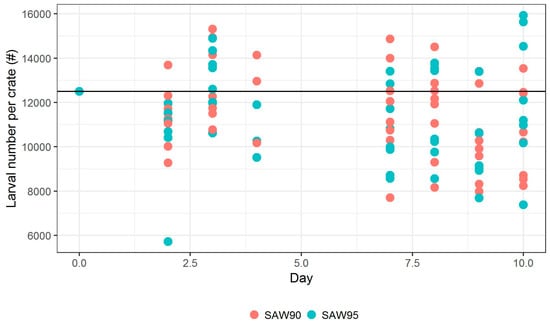 Number of larvae in each container was also estimated on multiple days. Figure 4 shows the estimation of these larvae numbers, showing their number per container. The black horizontal line shows the targeted population size of each container. At the first in-test measurements on Day 2, 3, and 4, we see a slight increase in population from under target line to above target line. Obviously, the population could not have increased; this increase is observed due to the increase in weight of larvae, which improves the ease of measurement. Approximately 10% and 20% decreases in population were observed on Day 8 and 9, respectively. The reason behind this is not known. On Day 10, the average mortality rate that was observed for SAW90 was 9.1% (SD 10.79%), while the mortality rate for SAW 95 was 15.4% (SD 16.28%). According to the Wilcoxon rank-sum test, we do not reject the null hypothesis that these mortality rates differ (p-value = 0.6454).