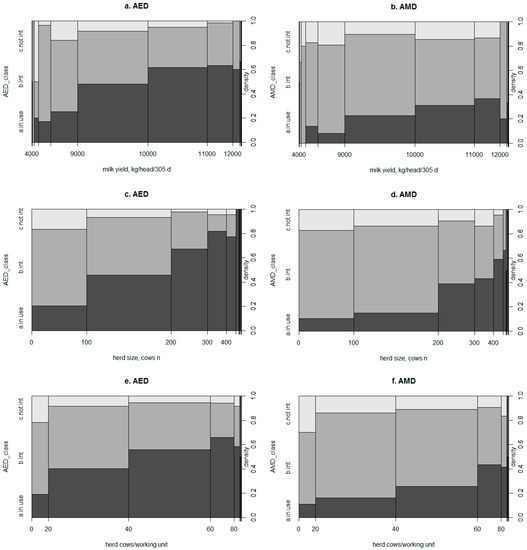 Spinograms for the distribution of farms with at least one sensor for (a,c,e) automated estrus detection (AED) or for (b,d,f) automated mastitis detection (AMD) with the (a,b) herd average 305- day MY (kg/head), (c,d) herd size (lactating plus dry cows n) and (e,f) cows per working unit ratio (n) as independent variables. The three different areas represent the proportions of interviewed farmers that used (dark-gray), were interested (medium-gray), or were not interested in using (light-gray) at least one form of the technology. The widths of the bars correspond to the relative frequencies of x, and the heights correspond to the conditional relative frequencies of y in every x interval.
