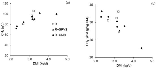 Relationship of the animals’ daily dry matter intake (DMI) to: (a) methane (CH4) emissions (R2 = 0.62); and (b) CH4 yield (R2 = 0.68). The legend in (a) also applies to (b). R, roughage (0.61 wheat straw + 0.39 Rhodes grass hay); SPVS, sweet potato vine silage: UMB, urea-molasses block; DMI, dry matter intake.