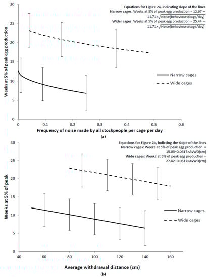 The largest effect was the effect of cage width grouping, with the wider cages (>60 cm) having at least a 10 week greater 5% peak egg production duration than narrow cages (≤50 cm), for laying houses with the same average withdrawal distance in the Stroll Test and noise behaviour made by all stockpeople (Figure 2). Despite the wide confidence limits in the predicted means in Figure 2a,b, the marginal slope for 5% peak egg production duration (weeks) on the square root of noise made by all stockpeople (behaviours/cage/day) and the marginal slope of 5% peak egg production duration slope per day on average withdrawal distance (cm) are greater than three (slope = −11.7 (SE = 3.29) for square root of noise frequency; slope = −0.062 (SE = 0.0192) for average withdrawal distance), and thus there is reasonably good precision for the estimation of these slopes. For laying houses with the same width cages, the number of weeks spent within 5% of the peak in egg production decreased by about 5 weeks from the laying houses with the least noise made by all stockpeople (AllSPNoise) to the laying houses with the most noise made by all stockpeople. There was also a 5-week difference between the laying houses with the smallest average withdrawal distance to the laying houses with the greatest average withdrawal distance.