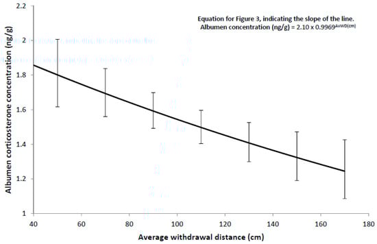 Relationship between albumen corticosterone concentration and the average withdrawal distance in the Stroll Test. Error bars represent 95% confidence intervals.