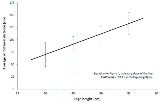 Relationship between average withdrawal distance in the Stroll Test and cage height. Error bars represent 95% confidence intervals.