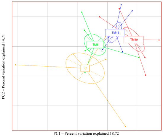 Principal Component Analysis (PCA) of the bacterial community composition in cecal samples of female broiler chickens fed with control (C), 5% (TM5), 10% (TM10) and 15% (TM15) inclusion levels of Tenebrio molitor meal diets.
