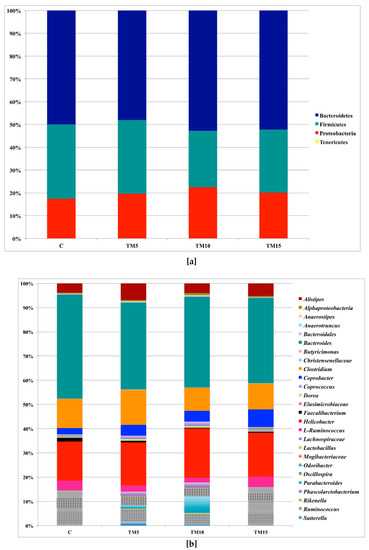 Bacteroidetes, Firmicutes and Proteobacteria comprised the major bacterial phyla identified in the cecal microbiota of the broiler chickens fed both the C and the TM-based diets in the present study, as previously observed in normal chickens [22,23,24,25]. However, the predominance of the phylum Bacteroidetes over Firmicutes is in contrast with these studies. The results of the current trial are more in agreement with what was observed in duck [26] goose [27] and turkey [28], where the dominant phyla, from high to low, have been reported to be Bacteroidetes, Firmicutes and Proteobacteria. It is well known that chickens and ducks employ roughage utilization [29] and Bacteroidetes members are involved in the digestion of complex polysaccharides [30]. Therefore, the above-mentioned phyla changes could reflect this poultry nutrition attitude.