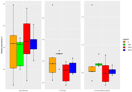 At the phylum level, the female broilers fed the 10 and 15% levels of TM meal inclusion in the current research displayed a decreased abundance of Firmicutes phylum and lower Firmicutes:Bacteroidetes ratios, respectively, than TM5-fed birds. It is well known that bacteria within the Firmicutes phylum may significantly influence both feed digestion and host health [40]. Furthermore, greater Firmicutes:Bacteroidetes ratios are generally associated with bacterial profiles that show a higher capacity of energy harvesting [41]. Based on these considerations, lower insect levels seem to be preferable for better modulation of gut microbiota. However, it is interesting to underline that the relative abundance of Firmicutes phylum began to increase from TM10 to TM15 diets, thus partially attenuating these negative findings.