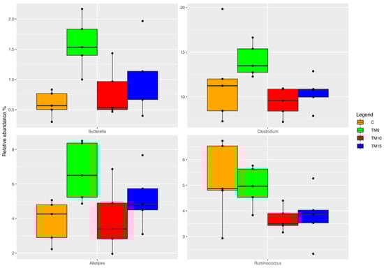 As far as genus level is concerned (Figure 4), the relative abundance of Sutterella, Clostridium and Alistipes was higher in the TM- than the basal diet-fed animals (FDR < 0.05). Differently, the birds fed the TM-based diets showed a significant decrease in the relative abundance of Ruminococcus in comparison with the C diet (FDR < 0.05).