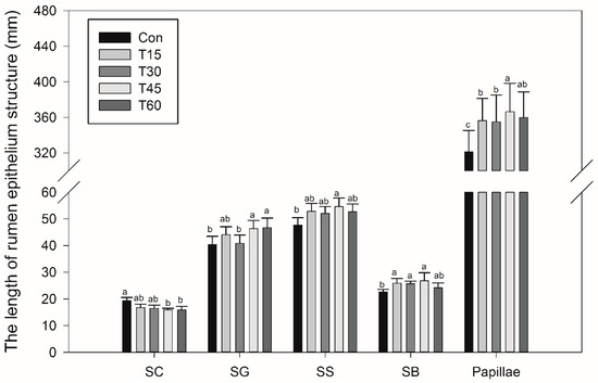 In ruminants, rumen bacterial species act as a more important factor in determining the extent and rate of feed degradation and utilization for the production of volatile fatty acid (VFA) in contrast to fungi and protozoa [7]. Tan et al. [8] reported that mulberry leaf meal along with urea can promote the population of ruminal cellulolytic bacteria of Brahman cattle. Niu et al. [9] also demonstrated that both mulberry leaves and mulberry fruit improve the abundance of total ruminal bacteria in finishing steers. Ruminal microbes degrade dietary carbohydrates to produce VFA, which acts as a chemical stimulating factor to promote the development of the rumen. If the VFA concentration is too low, the development of the rumen is inhibited as the lower VFA concentration could not meet the requirements for the growth of rumen papilla [10]. The morphologic traits on the rumen epithelium are the most important indicators of rumen development during the adaptation of rumen epithelium to VFA, as well as indicators of digestive, metabolic and absorptive capacity of rumen [11,12]. In turn, VFA affects the rumen morphology of animals especially the morphological structure of rumen epithelium [13]. Beiranvand et al. [14] reported that the morphological changes and branching of rumen papilla are mainly due to the stimulating effects of butyrate and propionate on the rumen cells.