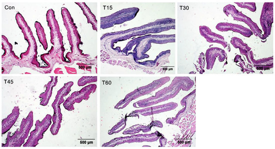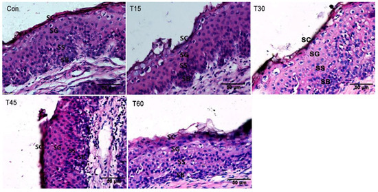 The width of the rumen papilla, SC, SG, SS and SB is shown in the Figure 1. The width of SC decreased (p = 0.04), whereas the width of ruminal papillae increased linearly as MLP supplementation increased (p = 0.03). The width of SG (p = 0.06) and SB (p = 0.08) also trended to increase. Moreover, the width of SS in T45 treatment was higher than the control treatment (p < 0.05). The morphological structure of rumen epithelium (20×) is shown in Figure 2 and the morphological structure of rumen papillae (4×) is shown in Figure 3.