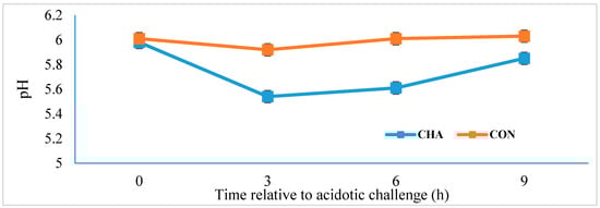 The mean rumen pH was lower (p = 0.04; SE = 0.09) in CHA (5.75) compared to CON treatment (5.99). In fact, the pH value of CHA treatment was below 5.8 for 6 h after the acidotic challenge (Figure 1).