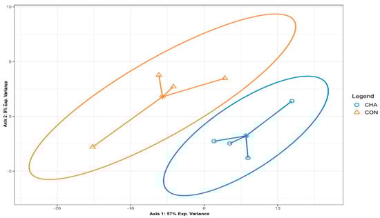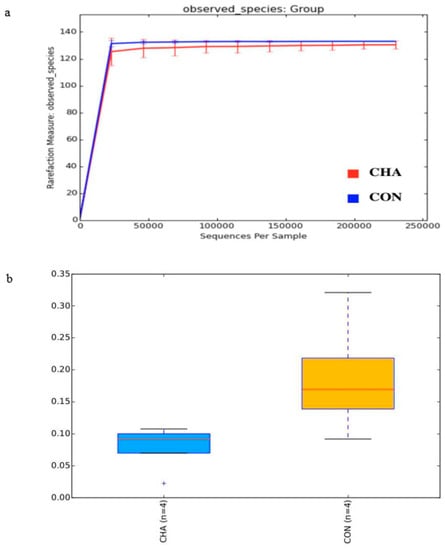Alpha diversity analysis revealed a decreased (p = 0.09) species richness within CHA (130.4) in comparison to CON (133.0) (Figure 2a). The species evenness (Heip’s estimator) of the transcriptionally active community was also reduced (p = 0.05) by CHA treatment in comparison to CON (Figure 2b). The reduction in species diversity observed in this study is a reflection of lower pH because low ruminal pH reduces the number of bacterial species, particularly the pH-sensitive species. Consequently, there is increased dominance (reduced evenness) of the low pH-tolerant microbial population [,]. This result agrees with Petri et al. [] who reported reduced rumen bacterial richness and diversity in beef cattle fed a high-grain diet.