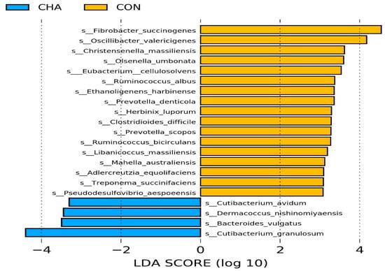 Linear discriminant analysis effect size (LEfSe) of rumen microbiota in beef cattle during the acidosis challenge. CHA = corn-induced acidotic challenge, CON = control (no challenge). The plot indicates the differentially abundant transcriptomic active taxa found by ranking according to their effect size (≥ 2.0) at the species level. The taxa enriched in beef cattle fed the control diet (CON) are indicated with a positive score (yellow), and taxa enriched in the corn-induced acidotic challenge treatment (CHA) have a negative score (blue). Only taxa meeting the significant threshold of 2.0 are shown.
