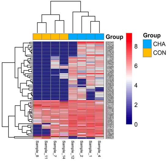 Partial least squares discriminant analysis revealed differential functional gene expression profiles between CHA and CON treatment groups when considering the RPKM-normalized KEGG annotations identified within each sample (Figure 5). Linear discriminant analysis effect size analysis revealed 68 functional genes that were differentially (LDA > 1.0, p < 0.05) expressed between CON and CHA treatments (Table S5). Seven functional genes had decreased expression while 61 genes were over-expressed in CHA treatment compared with CON. The heatmap analysis reveals the distinct gene expression profiles within CHA and CON groups (Figure 6).