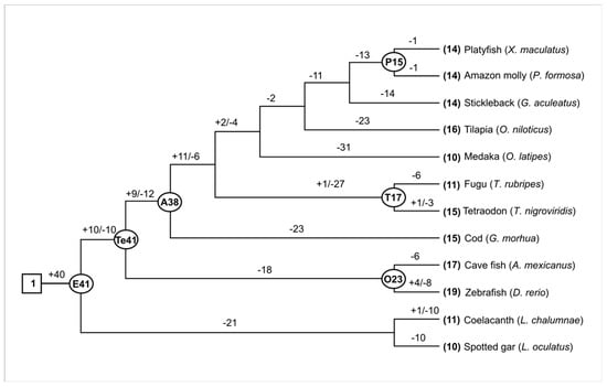 - Brunet, F.G.; Roest Crollius, H.; Paris, M.; Aury, J.M.; Gibert, P.; Jaillon, O.; Laudet, V.; Robinson-Rechavi, M. Gene loss and evolutionary rates following whole-genome duplication in teleost fishes. Mol. Biol. Evol. 2006, 23, 1808–1816. [Google Scholar] [CrossRef]