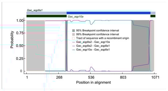Identification of recombination events between Gac_aqp8a1 and Gac_aqp10a genes. The plot display of recombination events was detected by the RDP method.