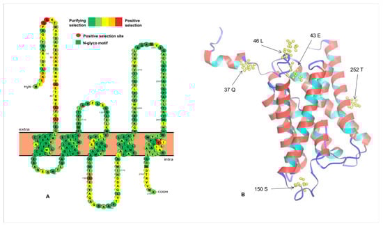 - Stern, A.; Doron-Faigenboim, A.; Erez, E.; Martz, E.; Bacharach, E.; Pupko, T. Selecton 2007: Advanced models for detecting positive and purifying selection using a Bayesian inference approach. Nucleic Acids Res. 2007, 35, W506–W511. [Google Scholar] [CrossRef]